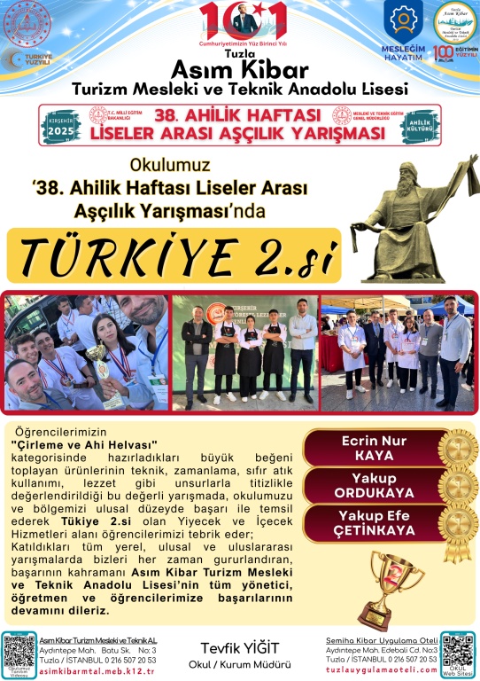 Tuzla Asım Kibar Turizm Mesleki ve Teknik Anadolu Lisesi olarak, bu yıl Kırşehir'de gerçekleştirilen 38. Ahilik Haftası kutlamaları kapsamında, ‘38. Ahilik Haftası Liseler Arası Aşçılık Yarışması’nda Türkiye 2.si olarak Gastronomi ve Mutfak Sanatları alanında her zamanki gibi büyük bir başarıya daha imza attık.